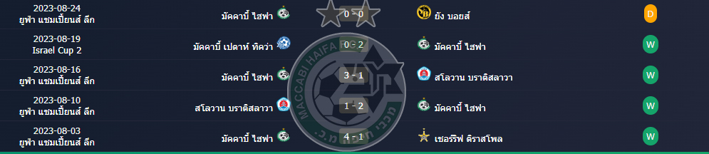 สถิติ 5 นัดหลังสุดของ : มัคคาบี้ ไฮฟา