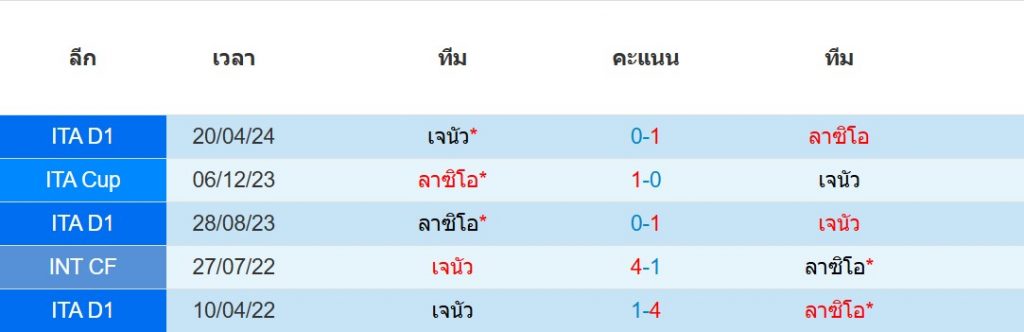 สถิติ 5 นัดหลังสุดของ : ลาซิโอ้ -vs- เจนัว