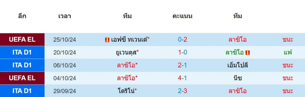 สถิติ 5 นัดหลังสุดของ : ลาซิโอ้