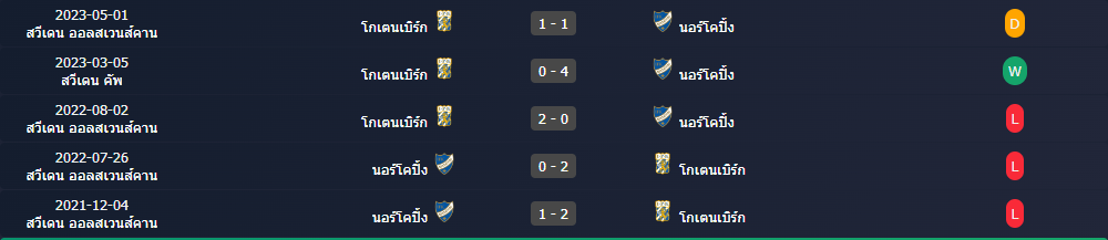 สถิติพบกัน 5 หลังสุดของ : นอร์โคปิ้ง -vs- โกเตนเบิร์ก