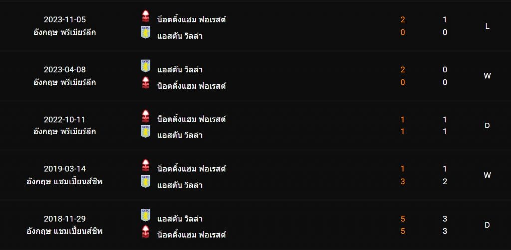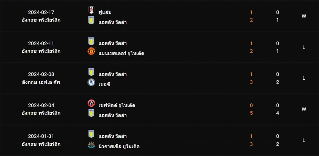 สถิติ 5 นัดหลังสุดของ : แอสตัน วิลล่า
