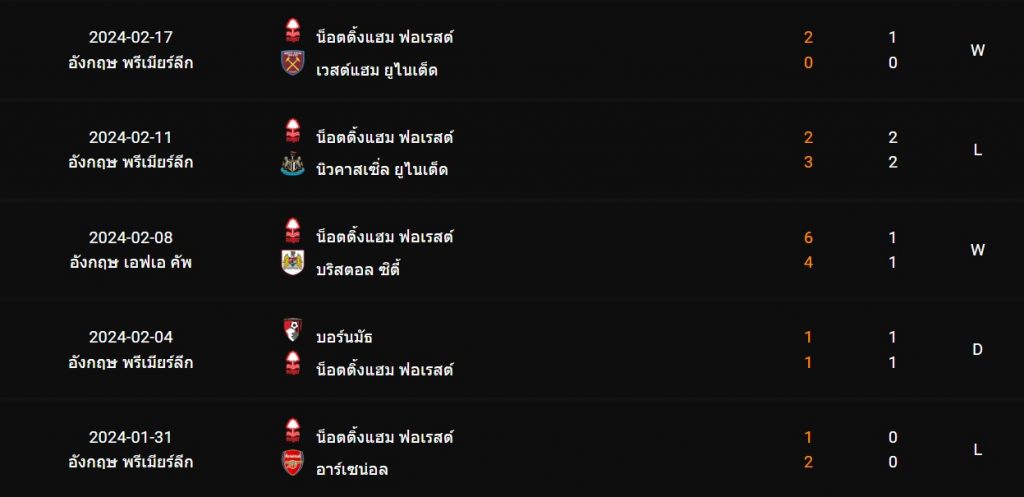 สถิติ 5 นัดหลังสุดของ : น็อตติ้งแฮม ฟอเรสต์
