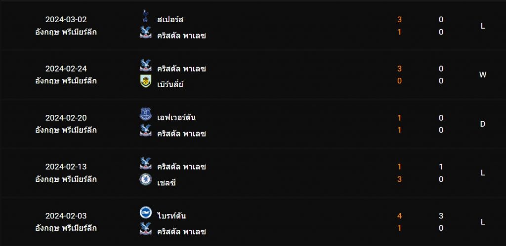 สถิติ 5 นัดหลังสุดของ : คริสตัล พาเลซ
