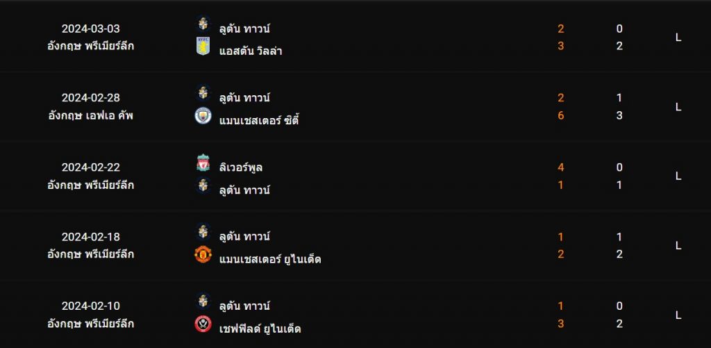 สถิติ 5 นัดหลังสุดของ : ลูตัน ทาวน์