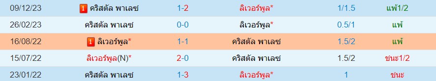 สถิติพบกัน 1 นัดหลังสุดของ : ลิเวอร์พูล -vs- คริสตัล พาเลซ