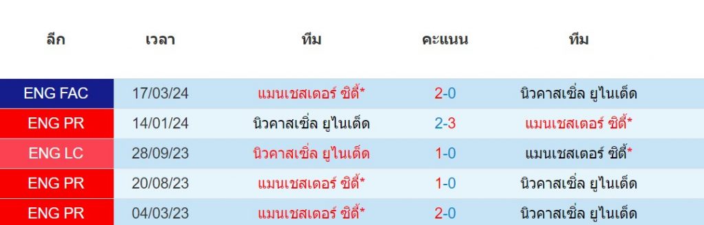 สถิติ 5 นัดหลังสุดของ : นิวคาสเซิ่ล -vs- แมนฯซิตี้