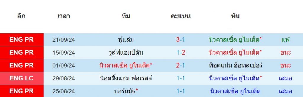 สถิติ 5 นัดหลังสุดของ : นิวคาสเซิ่ล