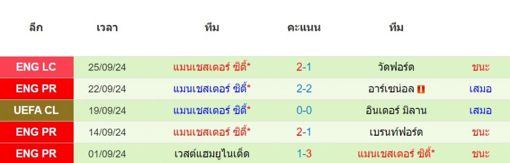 สถิติ 5 นัดหลังสุดของ : แมนฯซิตี้