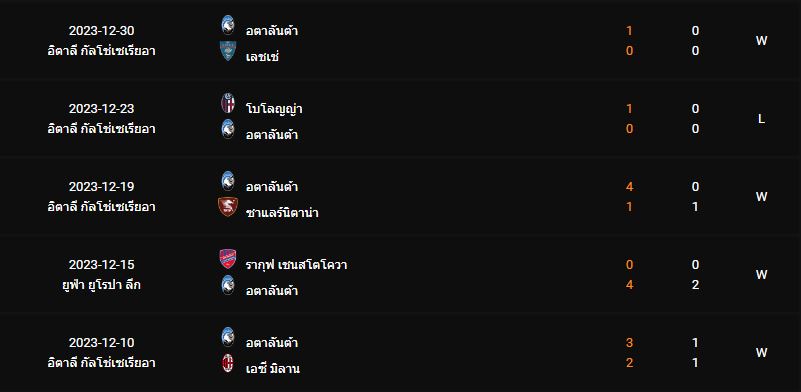 สถิติ 5 นัดหลังสุดของ : อตาลันต้า