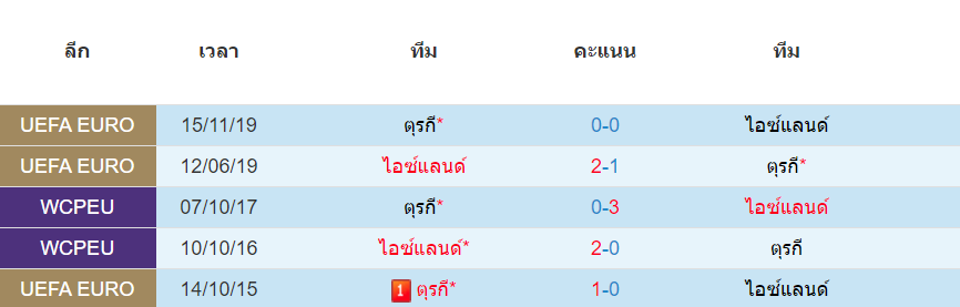 สถิติ 5 นัดหลังสุดของ : ตุรกี -vs- ไอซ์แลนด์