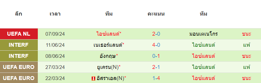 สถิติ 5 นัดหลังสุดของ : ไอซ์แลนด์