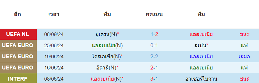 สถิติ 5 นัดหลังสุดของ : แอลเบเนีย