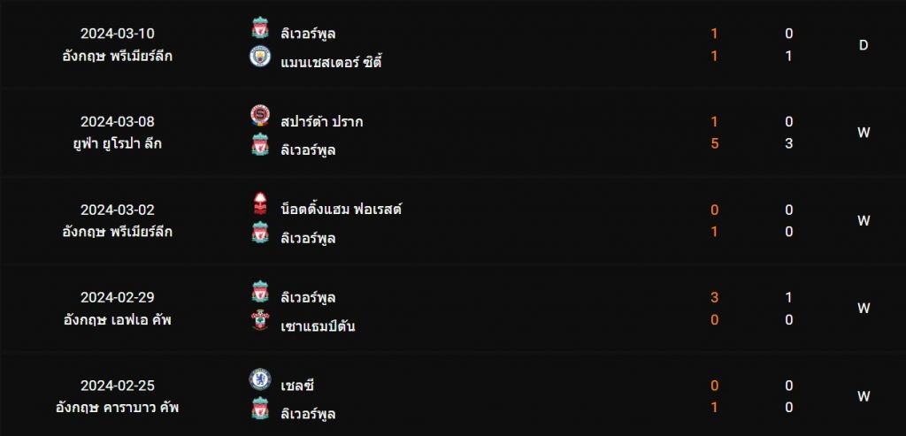 สถิติ 5 นัดหลังสุดของ : ลิเวอร์พูล
