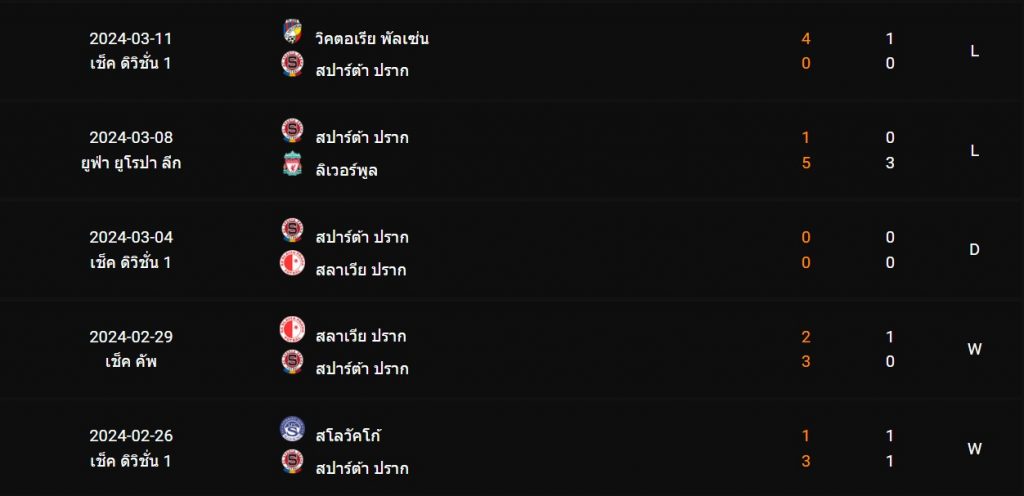 สถิติ 5 นัดหลังสุดของ : สปาร์ต้า ปราก