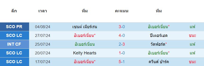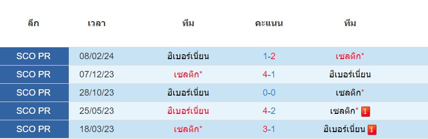 สถิติ 5 นัดหลังสุดของ : ฮิเบอร์เนี่ยน -vs- เซลติก