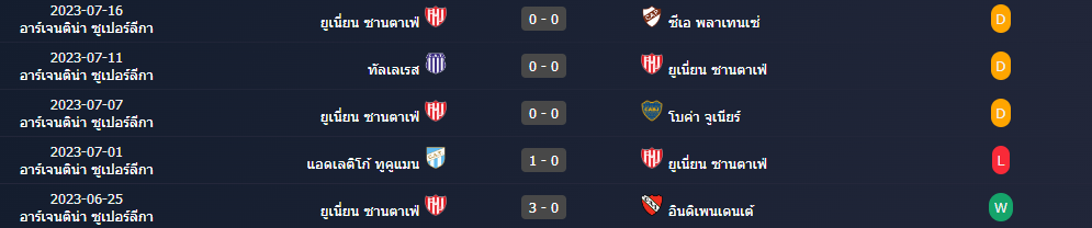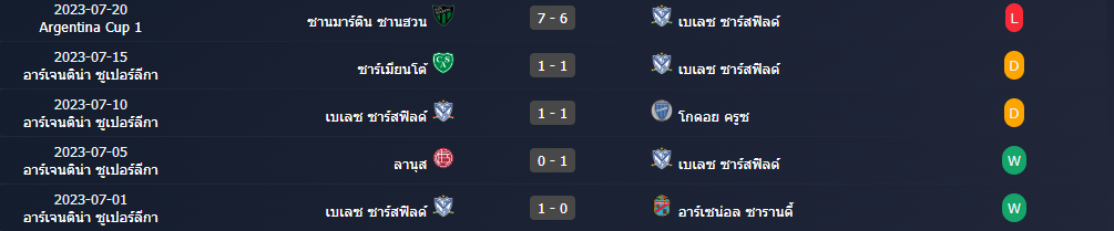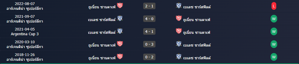 สถิติพบกัน 5 นัดหลังสุดของ : เบเลซ ซาร์สฟิลด์ -vs- ยูเนียน ซานตาเฟ่