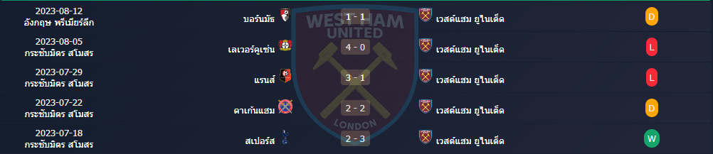 สถิติ 5 นัดหลังสุดของ : เวสต์แฮม ยูไนเต็ด