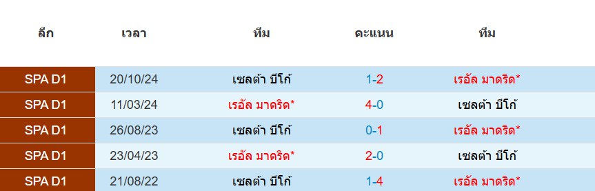 สถิติ 5 นัดหลังสุดของ : เรอัล มาดริด vs เซลต้า บีโก้