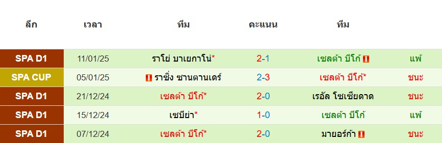 สถิติ 5 นัดหลังสุดของ : เซลต้า บีโก้
