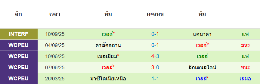 สถิติ 5 นัดหลังสุดของ : เวลส์