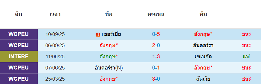 สถิติ 5 นัดหลังสุดของ : อังกฤษ