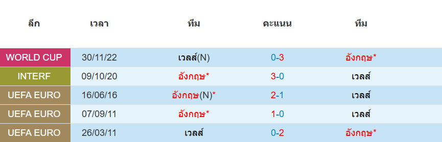 สถิติ 5 นัดหลังสุดของ : อังกฤษ vs เวลส์