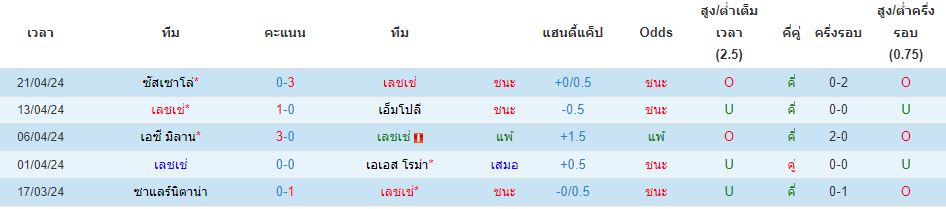 สถิติ 5 นัดหลังสุดของ : เลชเช่