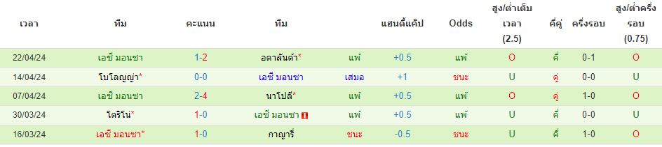 สถิติ 5 นัดหลังสุดของ : มอนซ่า