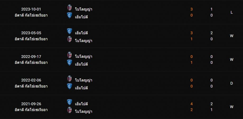 สถิติพบกัน 5 นัดหลังสุดของ : เอ็มโปลี -vs- โบโลญญ่า