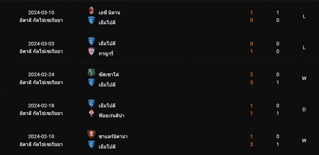 สถิติ 5 นัดหลังสุดของ : เอ็มโปลี