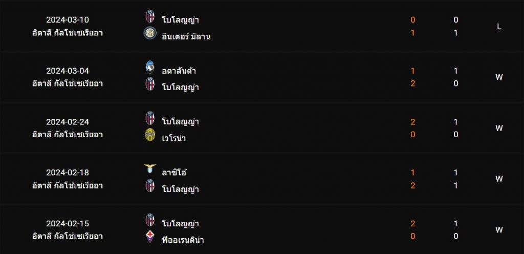 สถิติ 5 นัดหลังสุดของ : โบโลญญ่า