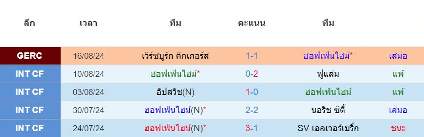 สถิติ 5 นัดหลังสุดของ : ฮอฟเฟ่นไฮม์
