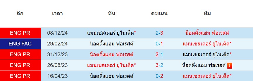 สถิติ 5 นัดหลังสุดของ : น็อตติ้งแฮม ฟอเรสต์ vs แมนฯ ยูไนเต็ด