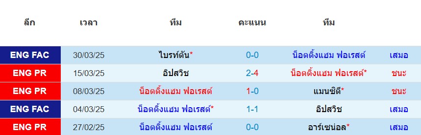 สถิติ 5 นัดหลังสุดของ : น็อตติ้งแฮม ฟอเรสต์