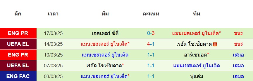 สถิติ 5 นัดหลังสุดของ : แมนฯ ยูไนเต็ด