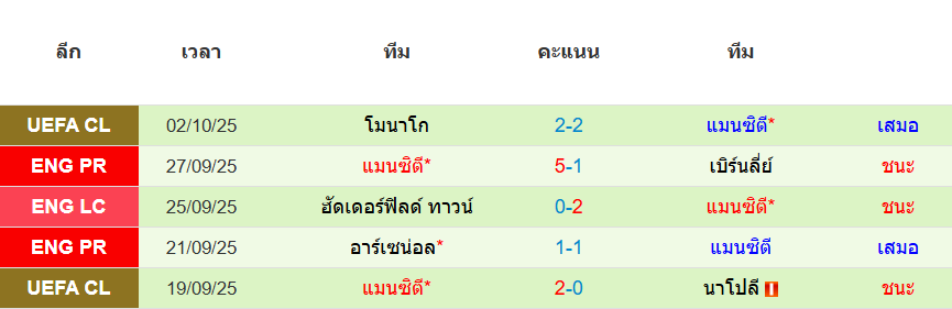 สถิติ 5 นัดหลังสุดของ : แมนฯ ซิตี้