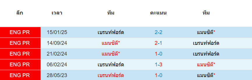 สถิติ 5 นัดหลังสุดของ : เบรนท์ฟอร์ด vs แมนฯ ซิตี้