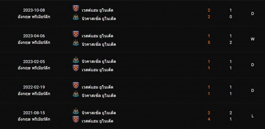 สถิติพบกัน 5 นัดหลังสุดของ : นิวคาสเซิ่ล -vs- เวสต์แฮม