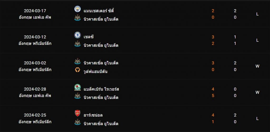 สถิติ 5 นัดหลังสุดของ : นิวคาสเซิ่ล