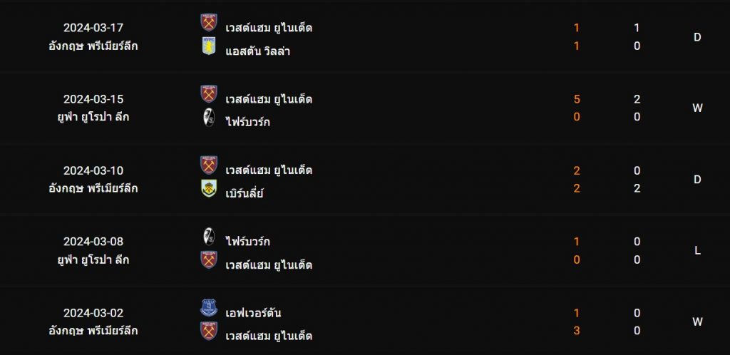 สถิติ 5 นัดหลังสุดของ : เวสต์แฮม