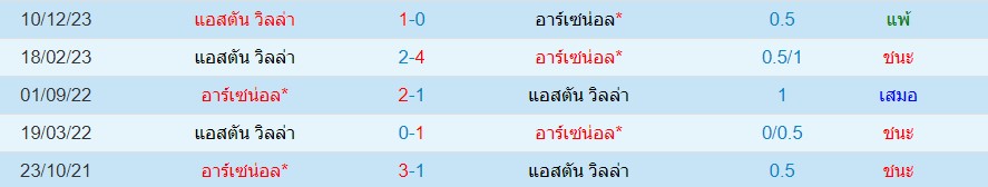 สถิติพบกัน 1 นัดหลังสุดของ : อาร์เซน่อล -vs- แอสตัน วิลล่า