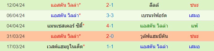สถิติ 5 นัดหลังสุดของ : แอสตัน วิลล่า