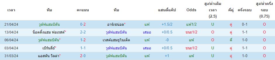สถิติ 5 นัดหลังสุดของ : วูล์ฟแฮมป์ตัน