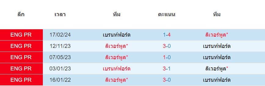 สถิติ 5 นัดหลังสุดของ : ลิเวอร์พูล -vs- เบรนท์ฟอร์ด