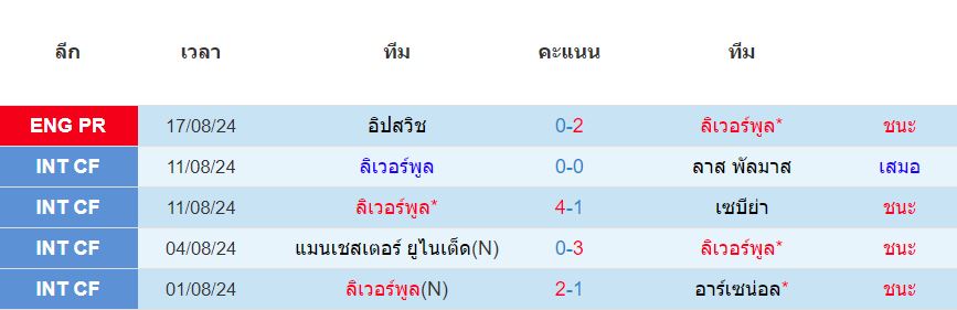 สถิติ 5 นัดหลังสุดของ : ลิเวอร์พูล