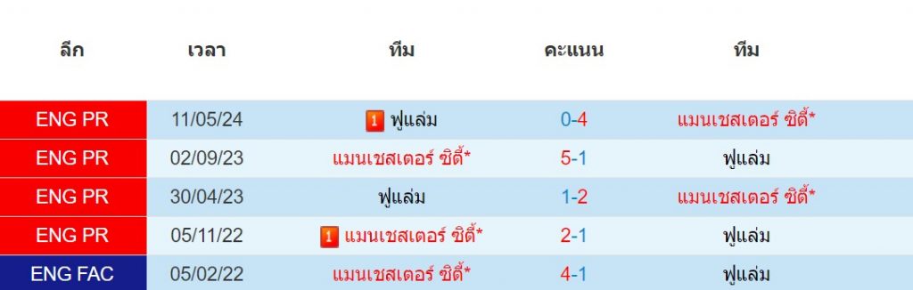 สถิติ 5 นัดหลังสุดของ : แมนฯ ซิตี้ -vs- ฟูแล่ม