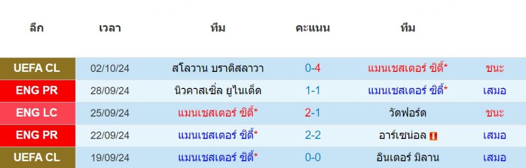 สถิติ 5 นัดหลังสุดของ : แมนฯ ซิตี้