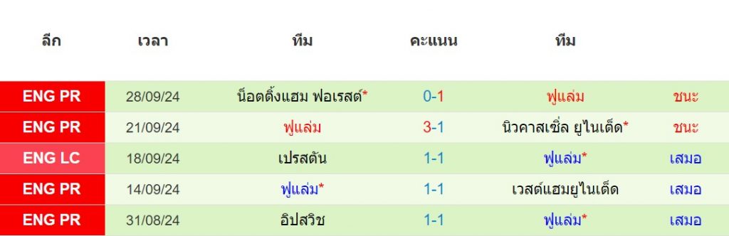 สถิติ 5 นัดหลังสุดของ : ฟูแล่ม