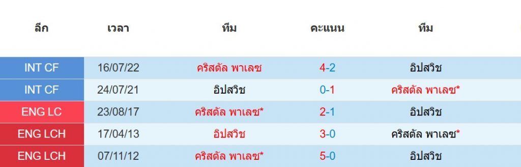 สถิติ 5 นัดหลังสุดของ : อิปสวิช ทาวน์ -vs- คริสตัล พาเลซ