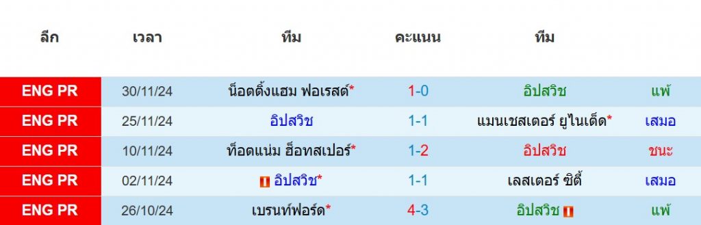 สถิติ 5 นัดหลังสุดของ : อิปสวิช ทาวน์
